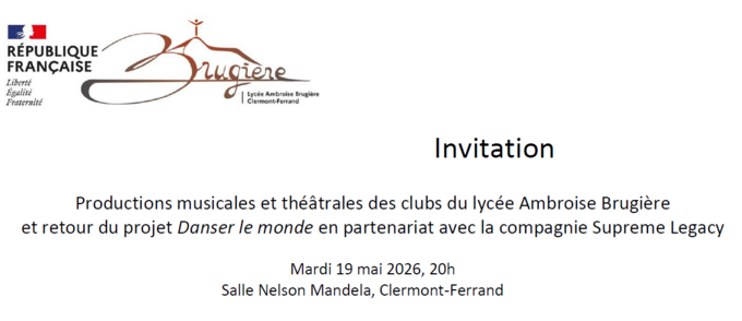 Par LAETITIA CHAPUT, publié le jeudi 30 avril 2026 10:32 - Mis à jour le jeudi 30 avril 2026 10:32Productions musicales et théâtrales des clubs du lycée et retour du projet Danser le monde en partenariat avec la compagnie Supreme Legacy Mardi 19 mai 2026, 20h Salle Nelson Mandela, Clermont-Ferrand -